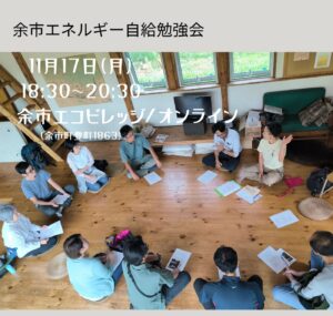 余市エネルギー自給勉強会 イベント 開催日 2025/11/17(月) 余市エコビレッジでは、サステナブルな食やエネルギー、住まいの実験・実践を進めてきました。本年度は、それを集落単位に広めたり、各家庭の資源を共有したりする「地域エネルギー」について学習したり、検討したりしています。本勉強会… 詳しく見る