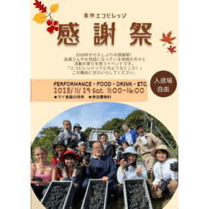 余市エネルギー自給勉強会 終了したイベント 開催日 2025/11/17(月) 余市エコビレッジでは、サステナブルな食やエネルギー、住まいの実験・実践を進めてきました。本年度は、それを集落単位に広めたり、各家庭の資源を共有したりする「地域エネルギー」について学習したり、検討したりしています。本勉強会… 詳しく見る
