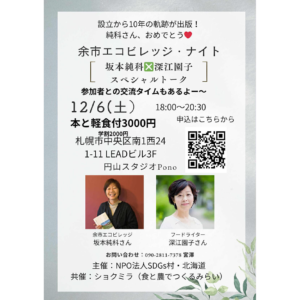 設立から10年の軌跡が出版!純科さん、おめでとう♥️ 余市エコビレッジ・ナイト 『坂本純科✖️深江園子 スペシャルトーク』 参加者との交流タイムもあります! ◆ 日 時:12月6日(土)18:00~20:30 ◆… 詳しく見る